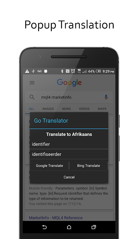 Provides the following options: tap to translate, copy translate ,widget translator , popup translation, vocabulary , pronunciation, real-life examples, phrasebook , SMS Translator and more.