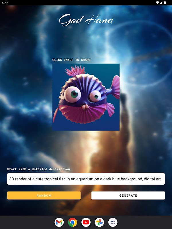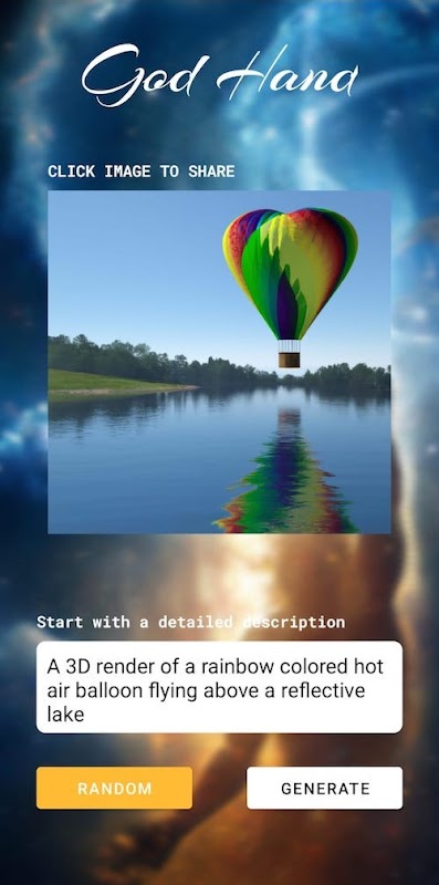 ลองใช้แอพ Hand of God - AI Image Maker ที่สนุกและรอคอยมากที่สุด ที่ให้คุณสร้างรูปภาพจากข้อความ คุณสามารถพิมพ์ข้อความของคุณเองเพื่อสร้างรูปภาพจากข้อความเหล่านั้น หรือสร้างรูปภาพแบบสุ่มก็ได้ เพียงอธิบายสิ่งที่คุณต้องการเห็น แล้วพระหัตถ์ของพระเจ้าจะทำให้มันมีชีวิต