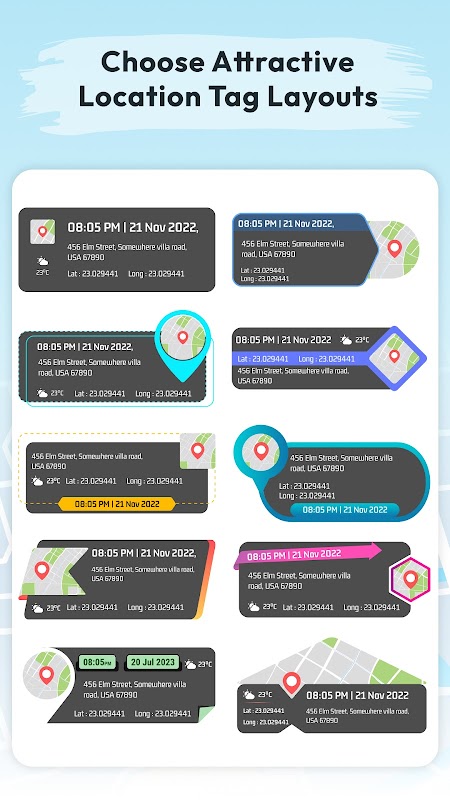• GEO Snap Style: แทรกภาพถ่ายของคุณลงในเทมเพลตสร้างสรรค์ที่แสดงรายละเอียด GPS ที่จำเป็น