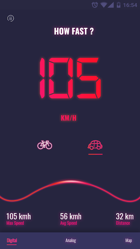 Your phone is now a fully functional analog/digital speedometer.Analog meter shows speed just like your car's speedometer using a dial and a needle. Digital speedometer will show current speed in digits.Speedometer GPS can track your current speed, maximium speed and distance also.