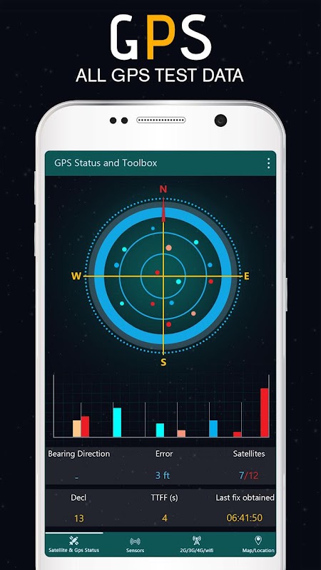 GPS status tool tests app have very easy to conduct temperature of monitor into prefacing tool app box and run counters very easy to use GPS test sensor. GPS status tool test app has detector satellites view, GPS info Accelerometer, gyroscope, and magnetometer.
