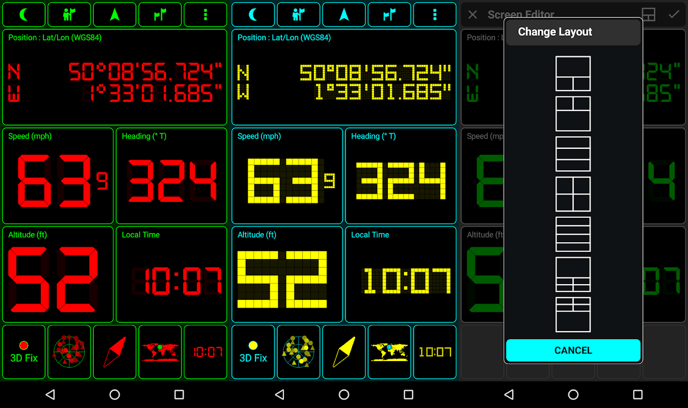 จีพีเอสพลัสทดสอบมีห้าหน้าจอเต็มรูปแบบของข้อมูล: -