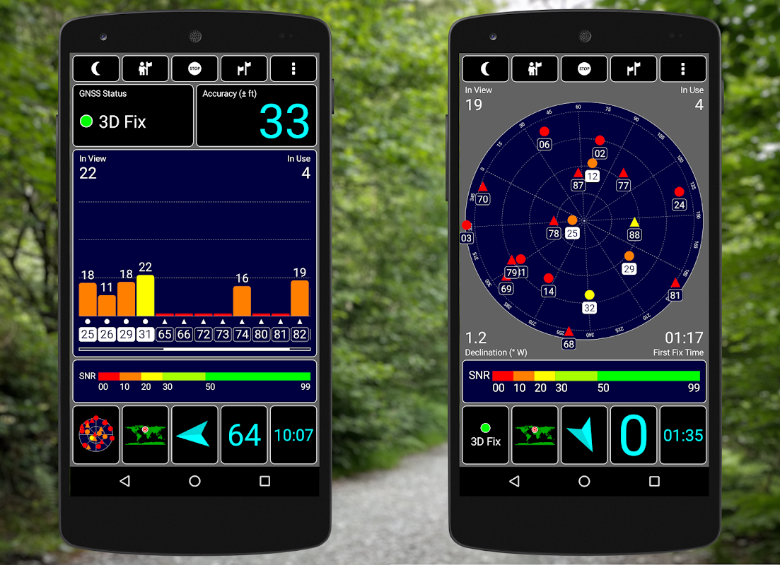 1) สัญญาณจีพีเอส (SNR) แผนภูมิแท่งแสดงความแรงของสัญญาณดาวเทียมสำหรับแต่ละเช่นเดียวกับความถูกต้องและสถานะของจีพีเอส