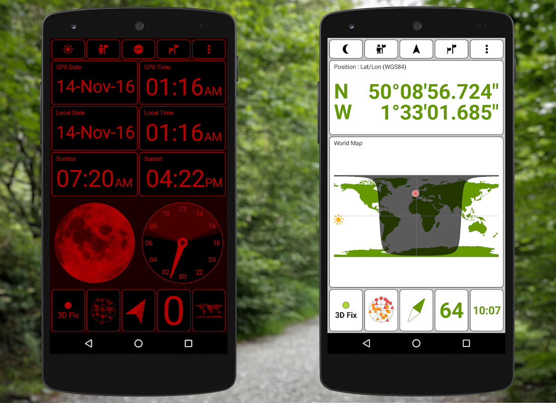 3) ตำแหน่งปัจจุบันของคุณบนโลกที่แสดงเป็นข้อความและบนแผนที่โลก ตำแหน่งปัจจุบันของดวงอาทิตย์และเส้นโค้งการเปลี่ยนแปลงวัน / คืนยังแสดงให้เห็น