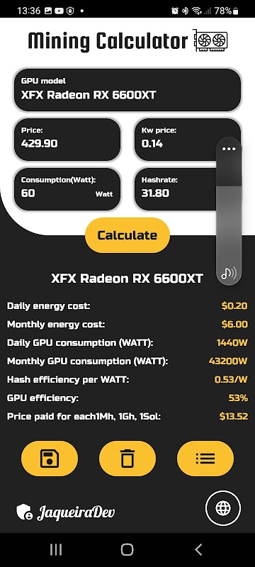 แอพนี้สามารถคำนวณและให้ผลลัพธ์สำหรับ: ค่าพลังงานรายวัน, ค่าพลังงานรายเดือน, การใช้ GPU รายวัน (WATT), การใช้ GPU รายเดือน (WATT), ประสิทธิภาพแฮชต่อ WATT, ประสิทธิภาพของ GPU และราคาที่จ่ายสำหรับแต่ละ 1Mh, 1Gh, 1Sol ดังนั้น สิ่งนี้สามารถช่วยให้คุณตัดสินใจได้ว่าตัวเลือกใดในการซื้อกราฟิกการ์ดที่ดีที่สุดสำหรับการขุด crypto ของคุณ