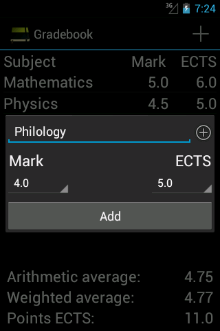 Gradebook - ects for the student or the student. Application designed for the student like a diary, in which the student is part of their assessment of a particular subject and is calculated the average for all subjects and for selected.