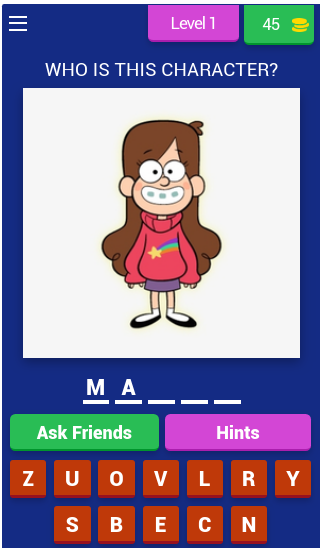 ตัวละครสุดโปรดจาก GRAVITY FALLS กำลังรอคุณอยู่ในเกมเดาแบบทดสอบตัวละครที่น่าตื่นเต้น! ในเกมตอบคำถามเกี่ยวกับตัวละครของเรานำเสนอตัวละครยอดนิยมที่คุณรู้จักเท่านั้น สิ่งที่คุณต้องมีในเกมตัวละครออฟไลน์คือการสะกดชื่อตัวละครจากตัวอักษรที่นำเสนอให้ถูกต้อง สำหรับแต่ละคำตอบที่เขียนถูกต้อง คุณจะได้รับเหรียญ หลังจากนั้นพวกเขาจะมีประโยชน์สำหรับคุณในการซื้อเคล็ดลับหากคุณไม่แน่ใจหรือไม่ทราบคำตอบของคำถามในแบบทดสอบตัวละครในเกม เกมตัวละครเดาไม่ยากถ้าคุณดูการ์ตูนอย่างระมัดระวัง