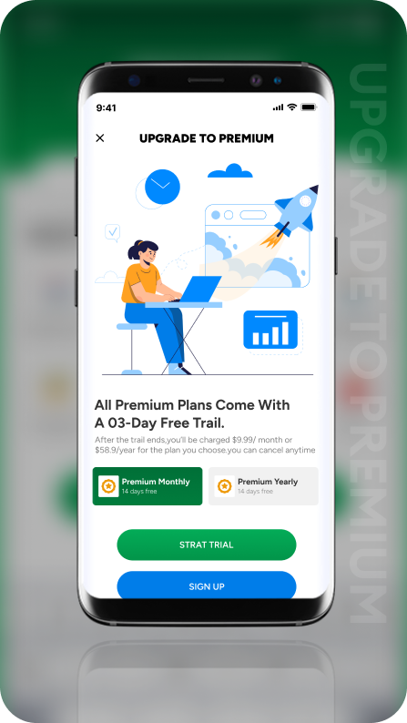 หน้าจออัปเกรดพรีเมียมจะแสดงสองแพ็คเกจ: รายเดือนและรายปี หลังจากเลือกแพ็กเกจแล้ว ผู้ใช้คลิก "เริ่มทดลองใช้" เพื่อเข้าสู่หน้าจอการสมัครสมาชิกแบบชำระเงินซึ่งแสดงรายละเอียดแพ็กเกจ