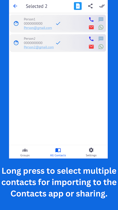 From All Contacts Now you can import(in device default contact app) and share selected contacts easily.