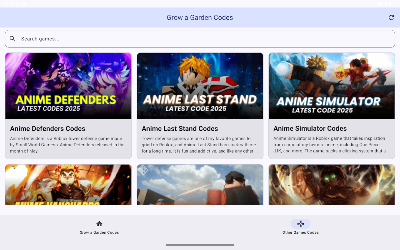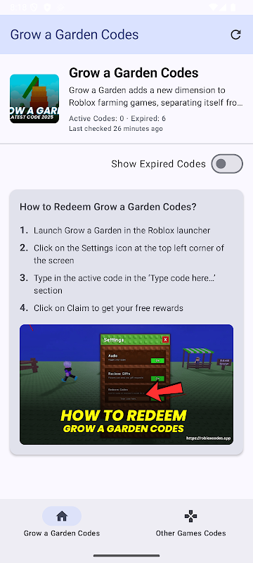 ทันทีที่คุณเปิดแอป คุณจะได้รับสิ่งที่สำคัญที่สุด: รายการรหัสที่ใช้งานได้ทั้งหมดสำหรับ Grow a Garden ไม่ต้องนำทางผ่านเมนูหรือหน้าจออื่น รางวัลจะอยู่ตรงหน้าและตรงกลาง