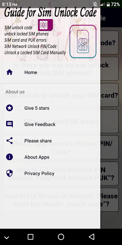 This app will be help you to unlock your locked sim card easy tips and guide.Unlock your phone in safely & permanently with SIM Unlock and connect to any Carrier.Easy way to unlock any sim card.An Android SIM unlock code generator is always useful.