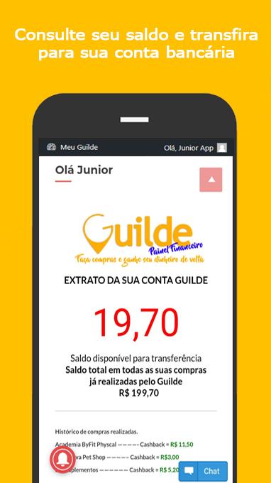 Somos um programa de resgate de dinheiro diferente de todos que você já viu! O Guilde usa o conceito de cashback, onde, ao invés de receber pontos, você recebe dinheiro de verdade em compras em lojas da sua cidade!