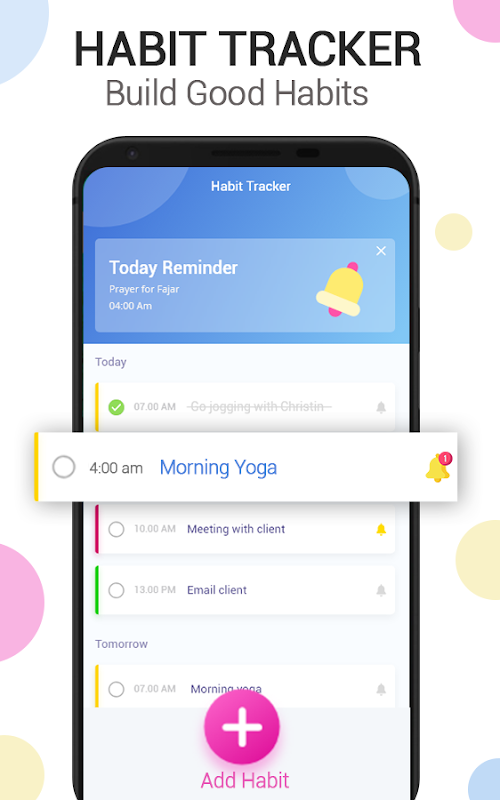แอพติดตามนิสัยช่วยให้คุณสร้างและรักษานิสัยที่ดีช่วยให้คุณบรรลุเป้าหมายระยะยาว จัดระเบียบชีวิตของคุณด้วยแอพติดตามนิสัยซึ่งคอยติดตามพฤติกรรมประจำวันและกิจวัตรประจำวันของคุณอย่างมีประสิทธิภาพ ตัวติดตามเป้าหมายต้องการวันที่สิ้นสุดในการสร้างนิสัยการเตือนจะเตือนคุณและจะแจ้งให้คุณทราบหากคุณมีพฤติกรรมที่ค้างอยู่ในเวลา