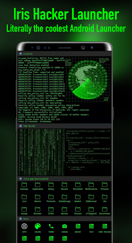 Iris Hacker Launcher is a cool, customizable, and hacker-styled home screen replacement. Iris Hacker Launcher brings hacker-styled features to perfect your home screens, while in the same time remains user-friendly. If you are tired of boring launchers, Iris Hacker Launcher is your best choice!