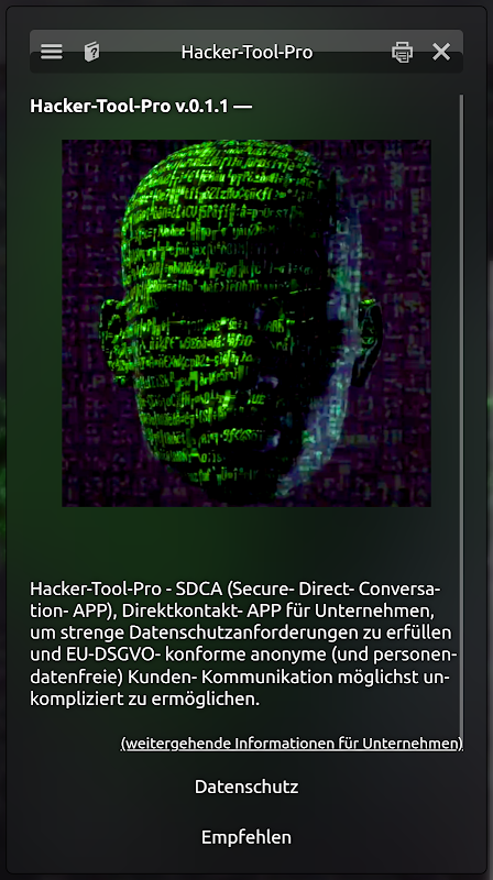 เครื่องมือแฮ็กเกอร์โดยปัญญาประดิษฐ์: Personal SDCA (Secure Direct Conversation App) ช่วยให้คุณสามารถสื่อสารได้โดยตรงและเป็นไปตามข้อกำหนดการปกป้องข้อมูลที่เข้มงวด ตลอดจนการสื่อสารกับลูกค้าที่ไม่ระบุตัวตน (และปราศจากข้อมูลส่วนบุคคล) ที่สอดคล้องกับ EU-GDPR