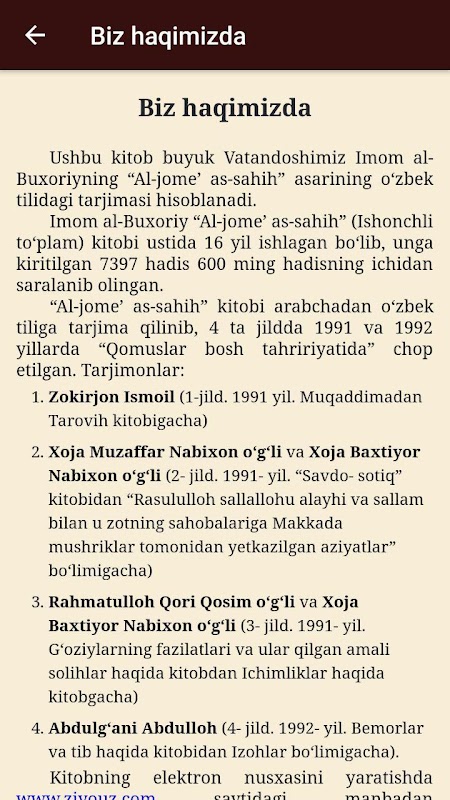 Ushbu kitob buyuk Vatandoshimiz Imom al-Buxoriyning“ Al-jome ’as-sahih” asarining o’zbek tilidagi tarjimasi hisoblanadi