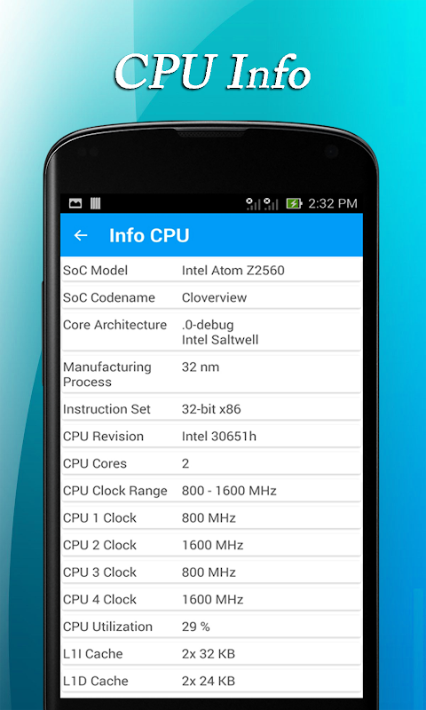 - CPU: SoC, Core Architecture, CPU Revision, CPU Cores and CPU Clock.