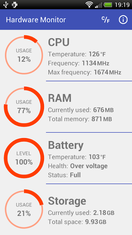 Simple but powerful tool for monitoring CPU, RAM, battery and storage values of your device.
