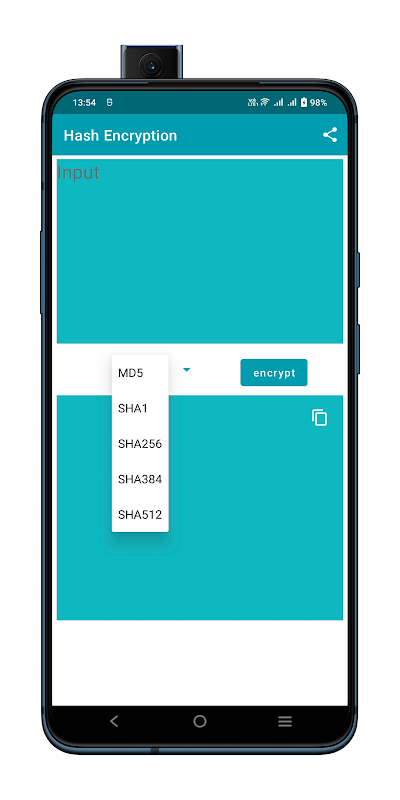 ในแอพนี้ข้อความที่จะแฮชโดย Md5, Sha1, Sha256, Sha384, Sha512 อัลกอริธึม