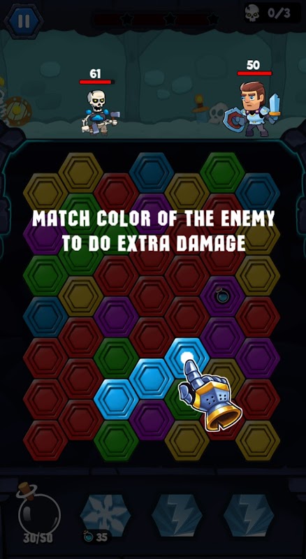 ที่คุณต้องกำจัดโครงกระดูก สำหรับการโจมตีของฮีโร่ที่แข็งแกร่ง ให้ยิงชิ้นส่วน Hexa Dungeon ที่มีสีเดียวกันเพื่อให้ผู้พิทักษ์จักรพรรดิปกป้องปราสาท
