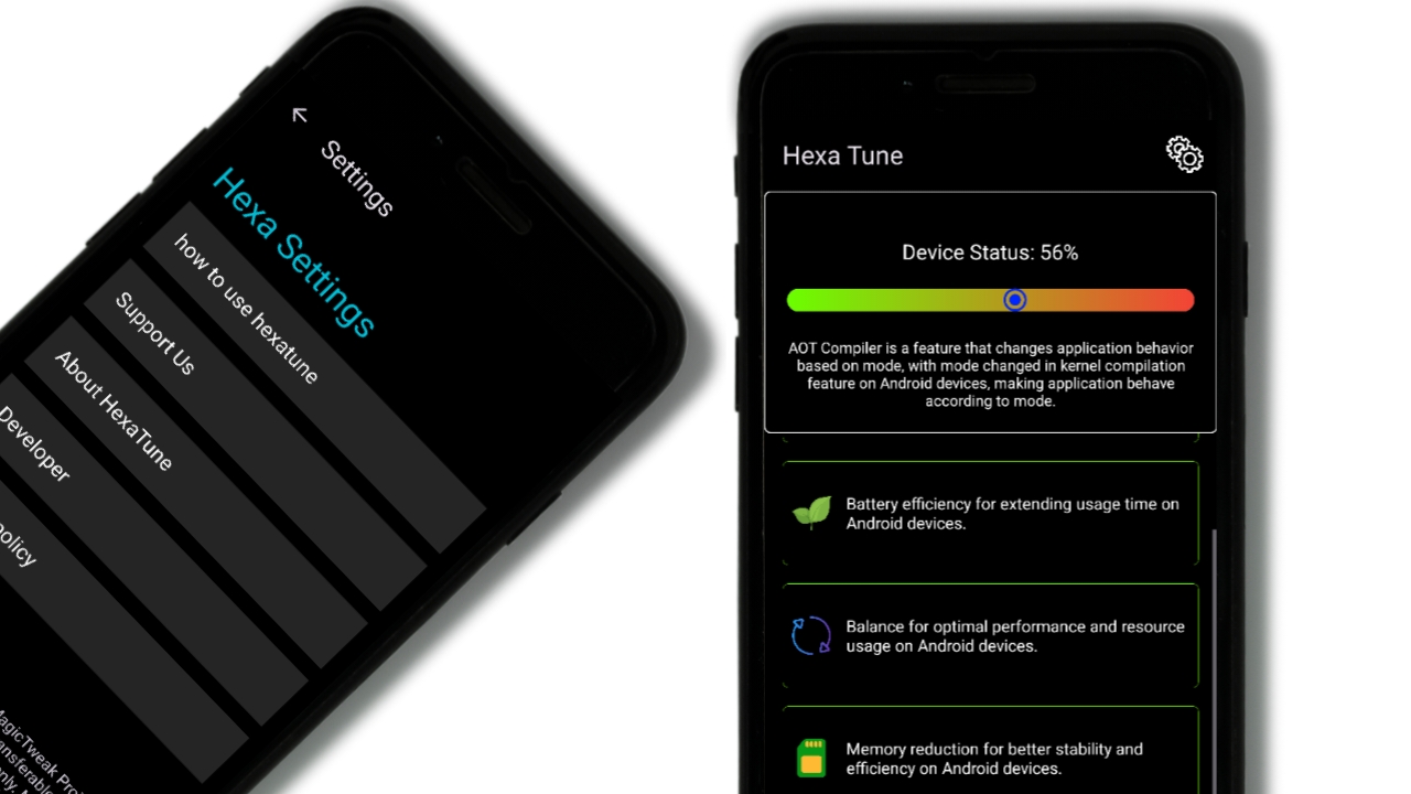 "Hexatune ปรับโหมดรันไทม์ของ Android หลายโหมดเพื่อปรับเปลี่ยนพฤติกรรมของแอปพลิเคชันระหว่างการเปิดตัวครั้งแรก ทำให้มีความเหมาะสมและก้าวร้าวมากขึ้น แต่ละโหมดในฟีเจอร์ของ Hexatune ต้องใช้เวลาพอสมควร ขึ้นอยู่กับจำนวนแอปพลิเคชันที่ติดตั้งบนอุปกรณ์ของคุณ"