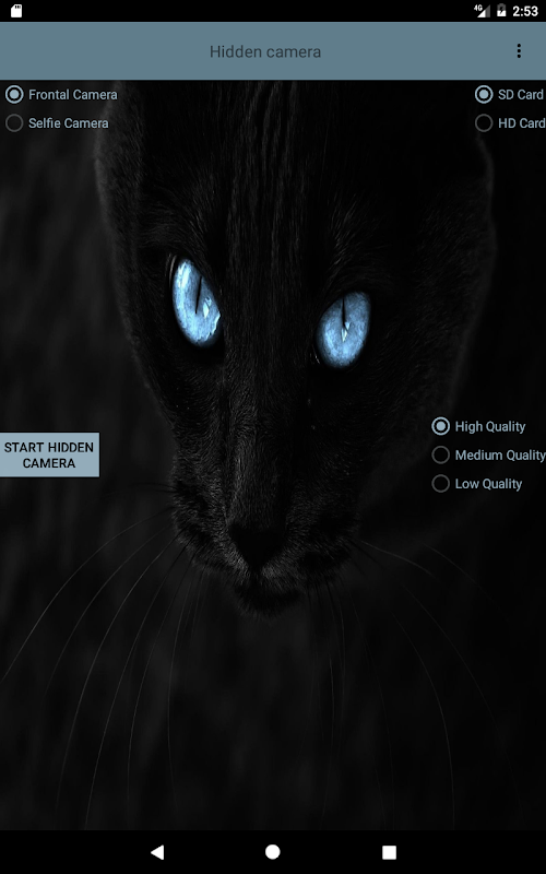 1)Hidden Camera. Saves battery and shoots video in stealth mode.The camera saves buttery power. The buttery lasts for seven days of continous sooting. This compact application work with settings High Quality,Medium Quality,Low Quality, Frontal Camera, Selfie Camera, HD path saved,SD path saved.