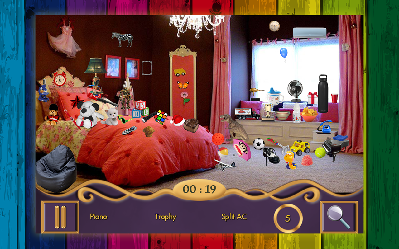 Hidden Object Games Kidsroom is one of our best hidden object games pre-loaded with 15 beautiful levels of kids rooms and house interior images. The messy kids rooms full of numerous little objects to search make it one of the best free hidden object games on Google play. It is a very challenging and addicting find hidden objects entertainment for kids.