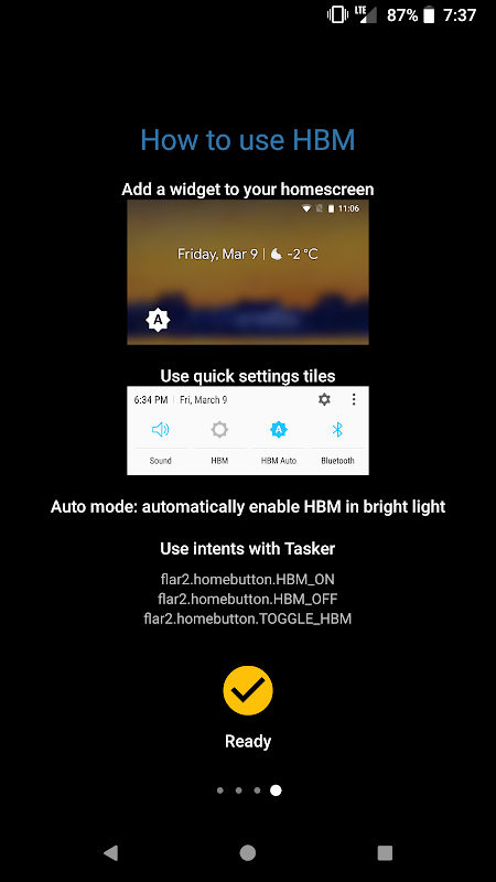 แม้ว่าโทรศัพท์ของคุณจะไม่มีการตั้งค่าฮาร์ดแวร์ HBM พิเศษแอพนี้จะบังคับให้ความสว่างหน้าจอสูงสุดซึ่งเป็นประโยชน์จริง ๆ เมื่อคุณอยู่นอกดวงอาทิตย์