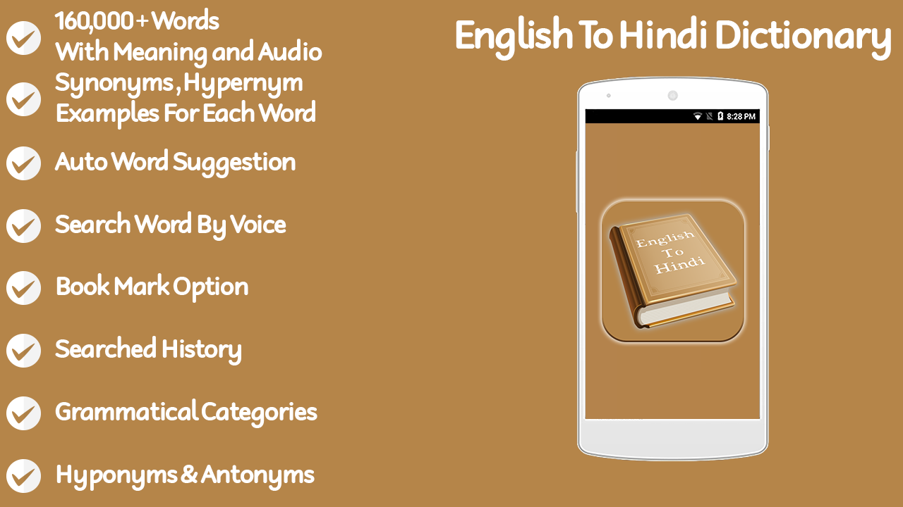 English to hindi dictionary have one lakhs plus word meaning in Hindi and English. This application will help you in building your vocabulary both in English and Hindi. This free dictionary is best offline learning tool. This application have auto words suggestion functionality means you don’t need to type complete word it will show words in suggestion just select your desired word. This application also provide audio pronunciation witch helps in pronouncing correct word in both English and Hindi.