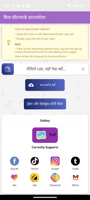 - 📥 ดาวน์โหลดวิดีโอจากแพลตฟอร์มโซเชียลมีเดียต่างๆ รวมถึง Facebook, Instagram, ShareChat, Josh, Moj และอื่นๆ