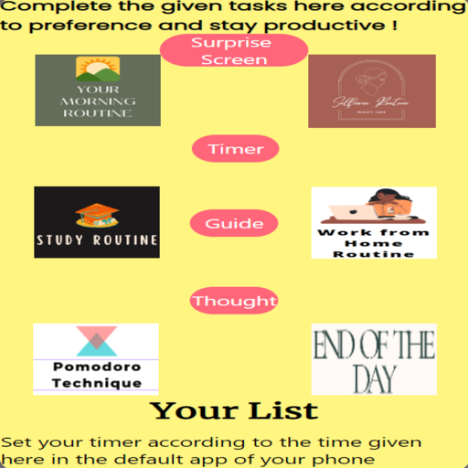 This app will boost your productivity and be your todo list for the whole day. You can plan your tasks. Once you've completed them you can delete them and continue to the next. It provides you with extra accessories such as Time, Task Map, Guide Screen, Thought of the Day to keep yourself motivated and a calendar. Hope you enjoy using the app and boost your productivity.