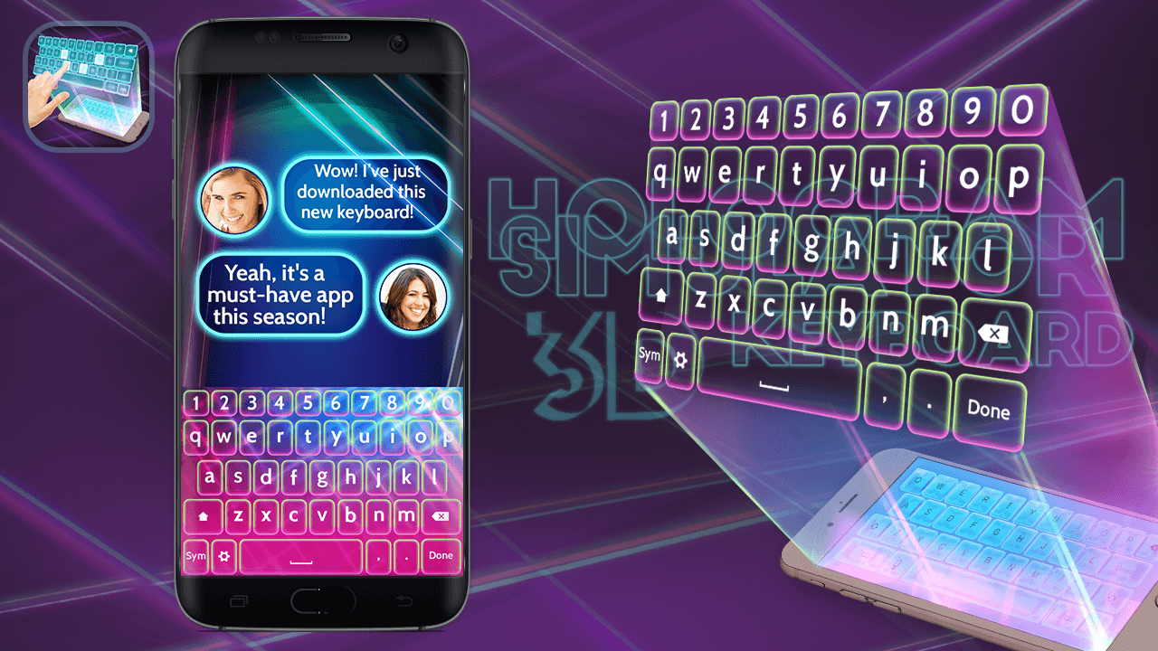 🎁📲💎 Create your own keyboard layout with our 3d “hologram projector”. Don't forget that this hologram keypad is intended for entertainment purposes only and does not provide real holographic displays! Install this fun hologram game and trick you friends into thinking that your device is a 3d hologram projector which projects “holographic wallpapers” and illuminated keyboards! Use these 3d holographic projection keyboard themes and get the best backlit keyboard you have always dreamed about!