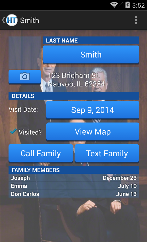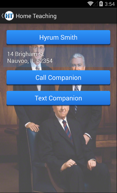 This app allows home teachers of The Church of Jesus Christ of Latter-Day Saints to keep all their information regarding home teaching in one convenient location. You can add as many families as you like to your home teaching list and save the necessary information about them and the members of each family. Call, text, or email your home teaching families from the app with a push of a button. Email a home teaching report to the person you report to. The email automatically gets filled in with info pulled from each individual family's page so you don't have to write anything. You can add to or edit the email before it is sent if you would like though. This app is an easy way for LDS home teachers to keep track of their visits each month. We'd love to hear your feedback to know what you like, things you would like to see in the app, or if you experience any type of bugs or glitches in the app.