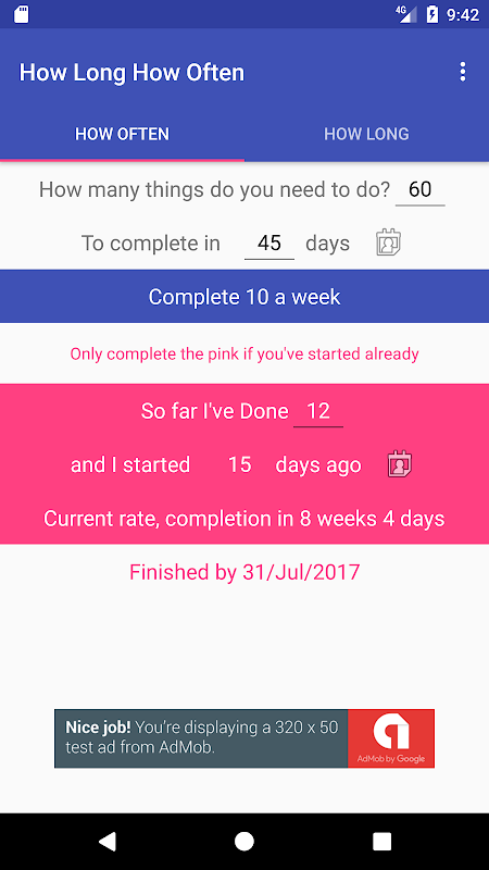 Just a simple app to help calculate how long it will take you to complete something, or how often you will need to do it to complete on time.