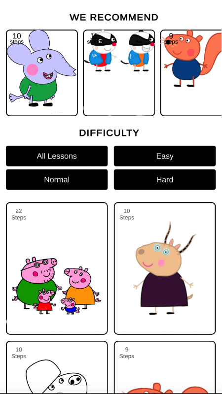 จะทำอย่างไรในแอปพลิเคชัน? เริ่มต้นด้วยเลือกตัวละครที่คุณต้องการวาด ก่อนหน้านั้นอย่าลืมเอากระดาษดินสอและซักผ้าแผ่น หลังจากเลือกฮีโร่ให้เริ่มบทเรียน! ทำซ้ำทุกขั้นตอนที่ได้รับในบทเรียนและคุณจะวาดอักขระที่เลือกได้อย่างง่ายดาย เชื่อฉันเถอะคุณไม่ต้องการประสบการณ์และทักษะในการวาดภาพ ทุกอย่างจะได้ผล! ทีละขั้นตอนให้ทำตามบทเรียนของวิธีการวาดแอปพลิเคชัน Peppa Pig และผลลัพธ์จะไม่เกิดขึ้นนาน!