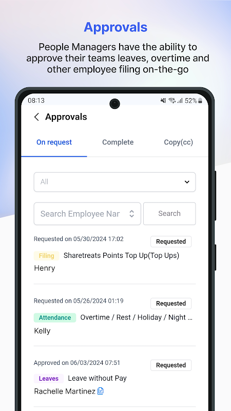 - ลดความซับซ้อนของกระบวนการขอลาและการอนุมัติ ทำให้พนักงานสามารถยื่นใบลาได้ง่าย และสำหรับผู้จัดการในการอนุมัติได้ทันที