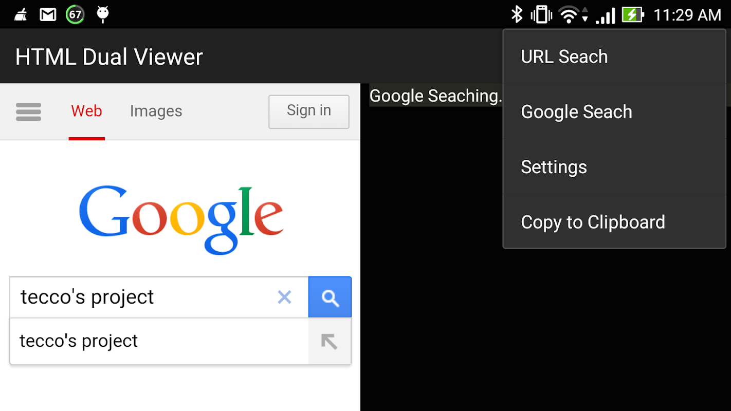 * มุมมองด้านซ้ายคือ WebView มุมมองด้านขวาคือ SourceView