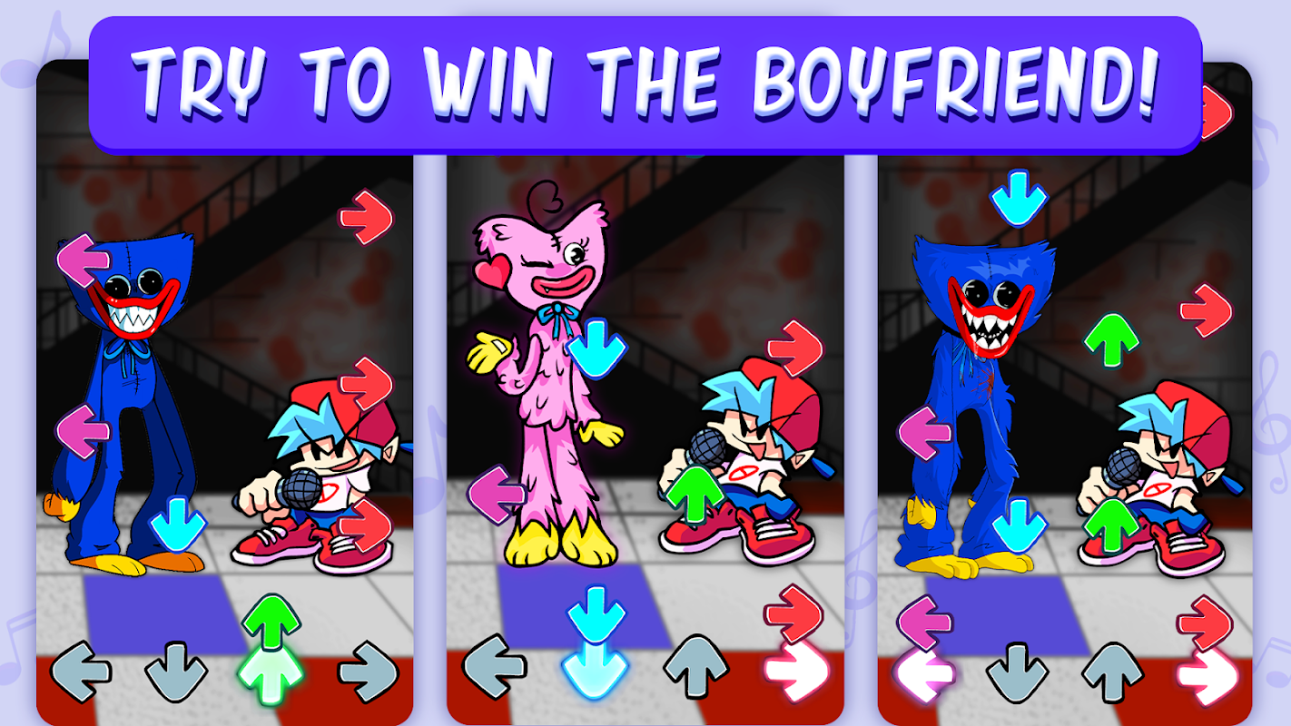 In this game you'll have fun, because it is not difficult, but very interesting and exciting, try to defeat the Huggy Wuggy, and to do your best score in this funkin music battle game as much as possible to protect your girlfriend!