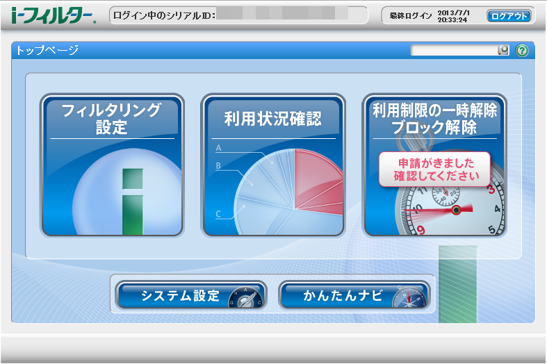 ด้วย "i-Filter" คุณไม่เพียงแต่สามารถจัดการข้อมูลต่างๆ จากระยะไกล เช่น สถานะการใช้งานอินเทอร์เน็ตของบุตรหลานและเปลี่ยนระดับความแรงของการกรอง แต่ยังตรวจสอบประวัติการใช้อินเทอร์เน็ตและข้อมูลตำแหน่งได้จากหน้าจอการจัดการที่สะดวกสบาย อุ่นใจ .