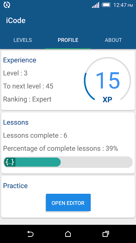 Levels are unlocked as you progress through each lesson, lessons give experience points each time they are unblocked.