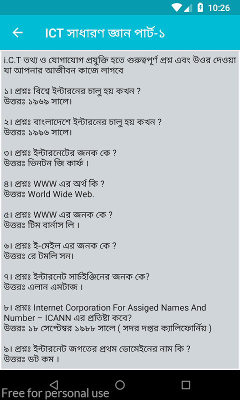 ICT সাধারণ জ্ঞান 2022 (Shadharon gan) ও বিভিন্ন নিয়োগ পরীক্ষার প্রস্তুতি MCQ নিয়ে তৈরি আমাদের এই অ্যাপ্লিকেশন। ICT সাধারণ জ্ঞান (New Shadharon gan 2022) সব ধরনের মানুষের জন্য খুব গুরুত্বপূর্ণ ভুমিকা পালন করে। ICT সাধারণ জ্ঞান ( General Knowledge ) জানা অজানা অনেক প্রশ্ন ও উত্তর দিয়ে তৈরি এই অ্যাপটি। ICTবেসিক সাধারণ জ্ঞান (Basic Shadharon gan) প্রতিটা মানুষের অর্জন করা প্রয়োজন যেন আগে থেকেই সব প্রকার পরীক্ষার প্রস্তুতি প্রস্তুতি নিতে পারবেন । ICT সাধারণ জ্ঞানের দরকার হয় বিভিন্ন নিয়োগ পরীক্ষা দিতে গেলে, যে কোনো প্রতিষ্ঠানে অ্যাডমিশন দিতে গেলেও দরকার পরে। তাই আপনার কাজের জন্য পস্তুতি নেবার জন্য সাধারণ জ্ঞান অ্যাপটি। সাধারণ জ্ঞান (ICT General Knowledge 2022) বর্তমান আমদের কতোটা দরকার, সেটা আমরা বুঝি কোন পরীক্ষা দিতে গেলে। সাধারণ জ্ঞান (General Knowledge Bangla) থেকে আপনি বাংলাদেশ ও আন্তর্জাতিক বিষয় সহ অনেক আলোচ্য জ্ঞান অর্জন করতে পারবেন। General Knowledge থেকে বিশ্বের অনেক দেশের জানা অজানা প্রশ্ন ও উত্তর পাবেন এই জ্ঞানের ভাণ্ডার Apps থেকে। সাধারণ জ্ঞান (Shadharon Gan in bangla) ওয়ার্ল্ড ওয়াইড জ্ঞান বহন করে আপনাকে করে এরও অধিক শক্তি শালি। ICT-MCQ General Knowledge 2021 সাধারণ জ্ঞান (আন্তর্জাতিক সাধারণ জ্ঞান ) বিশ্ব-বিখ্যাত নদি-সাগর, বিশ্ব-বিখ্যাত বন-জংগল, বিভিন্ন দেশের জনসংখার প্রশ্ন ও উত্তর এর সাথে আপনাকে পরিচয় করাবে। সাধারণ জ্ঞান একটি অমূল্য রতন যার ব্যবহার করতে জানলে জীবনে অনেক কিছু অর্জন করা যায়। জ্ঞান অর্জন করা ফরজ তাই কেউ কোন সময় কারো থেকে এটাতে মনঃক্ষুণ্ণ হবেন না। কোন চাকরি করতে গেলে আগে নিবন্ধন পরীক্ষায় উত্তীর্ণ হতে হয় , আর এই গুলোর মধ্যে থাকে একশত মার্কের ICT সাধারণ জ্ঞান, বাংলা, ইংলিশ, অংক, থেকে এবং নির্দিষ্ট গ্রুপ ভাবে একশত মার্ক।সাধারণ জ্ঞান (Bangla Sadharon Gan) Apps থেকে পড়তে থাকেন তাহলে সব পরিবেশের সাথে মোকাবেলা করতে পারবেন। সাধারণ বিজ্ঞান (ICT Bangla MCQ) এর মাধ্যমে আপনারা অনেক বেশি জ্ঞান অর্জন করতে পারবেন। সাম্প্রতিক সাধারণ জ্ঞান ২০২0 MCQ রয়েছে আমাদের অ্যাপ এ। সাধারণ জ্ঞান (ICT New MCQ) এ ভালো নজর দিয়ে দেখে-পড়ে এক্সাম দিতে হবে এবং General Knowledge এর সাথে আমদের বিশ্বের কিছু দেশের রাজধানীর নাম, প্রেসিডেন্ট এর নাম, ICT সম্পর্কিত কম্পিউটার এর ধারণা থাকলে ভালো হবে। সাধারণ জ্ঞান এমনই একটি শক্তি যেটা আপনাকে সব দিক থেকে জিতিয়ে আনতে পারে। এই জন্য আপনাকে অনেক বেশি সাধারণ জ্ঞান কারেন্ট অ্যাফেয়ার্স ২০২০, Shadharon Gan ২০২১ ও ICT পড়তে হবে। এই অ্যাপ্লিকেশনটি থেকে আপনি পড়তে পারবেন, ICT সাধারণ জ্ঞান ও নিয়োগ পরীক্ষার প্রস্তুতি MCQ, কমন প্রশ্ন ও উত্তর।সাধারণ জ্ঞান ও জ্ঞানের ভাণ্ডার যেখানে চারটি পার্ট আলাদা করে দেওয়া আছে এই অ্যাপের ভেতরে। সাধারণ জ্ঞান (Basic General Knowledge) বাংলাদেশের সম্পর্কে অধিক তথ্য ও প্রশ্ন দিয়ে সাহায্য করে। সাধার