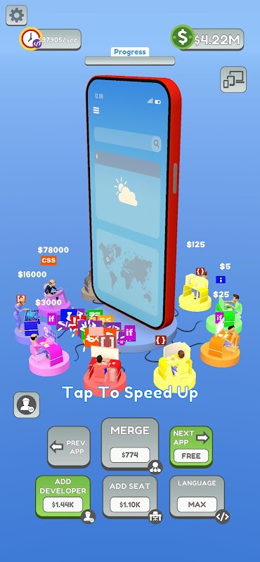 ในเกมนี้ ผู้พัฒนาเกมจะพัฒนาวัตถุต่าง ๆ ด้วยความช่วยเหลือของคุณ เล่นง่ายและสนุกเกมนี้เริ่มต้นด้วยผู้พัฒนาเกมเพียงคนเดียวในตอนเริ่มต้น ขึ้นอยู่กับคุณเร่งพัฒนาเกมที่เขียนโค้ดบนคอมพิวเตอร์ คุณสามารถเร่งความเร็วผู้พัฒนาเกมได้ด้วยการแตะที่หน้าจอ