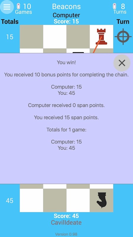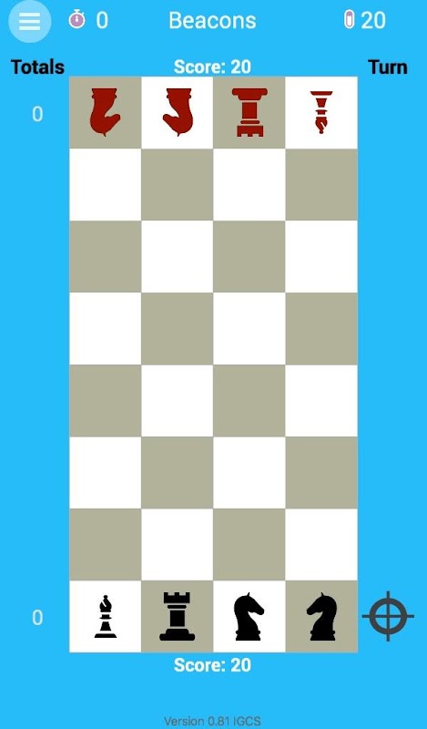 Strategy 2-player game with 4 chess pieces and half a chessboard. The pieces represent beacons, and the goal is to connect your beacons in a chain with the last one on the end line. Play against the computer or play against another player on the same device, or against a remote player through the Google Play Game Services.