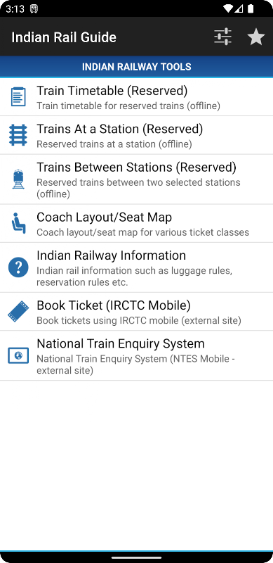 Indian Rail Guide is a travel companion app for the frequent travellers of Indian Railways. With Indian Railway Guide, you can access train timetable, trains available at a station, trains between stations and much more from your mobile. Indian Railway Guide app has the following train enquiry features,