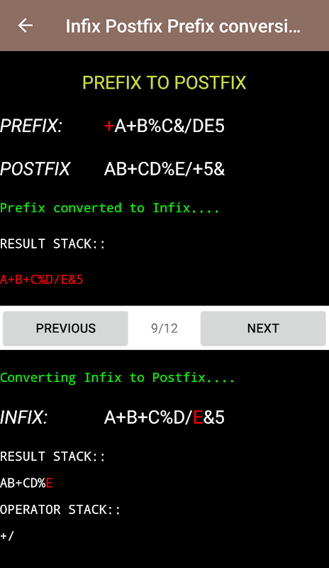 This app helps you in not only converting Infix/Prefix/Postfix Expressions but also provides step by step guide so that you can easily understand how these conversions are taking place.