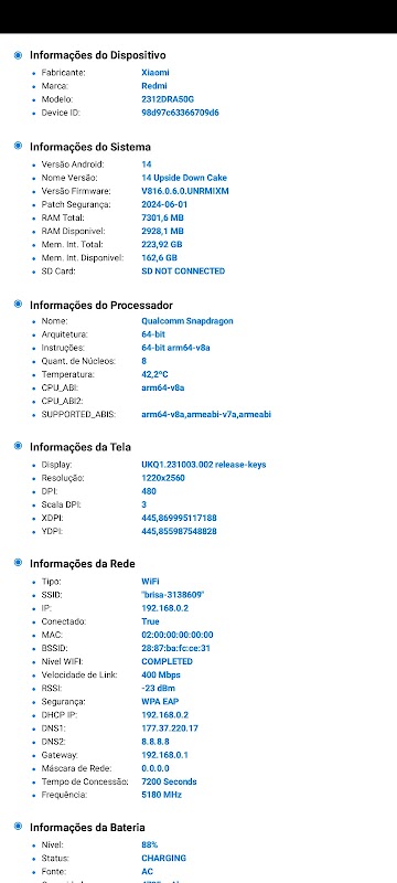 - **ข้อมูลแบตเตอรี่**: ตรวจสอบสถานะแบตเตอรี่ปัจจุบัน ความสามารถในการชาร์จสูงสุด แรงดันไฟฟ้า อุณหภูมิ และสุขภาพแบตเตอรี่โดยรวมของอุปกรณ์ของคุณ ข้อมูลนี้มีความสำคัญต่อการตรวจสอบประสิทธิภาพการใช้พลังงานและความทนทานของอุปกรณ์ของคุณเมื่อเวลาผ่านไป
