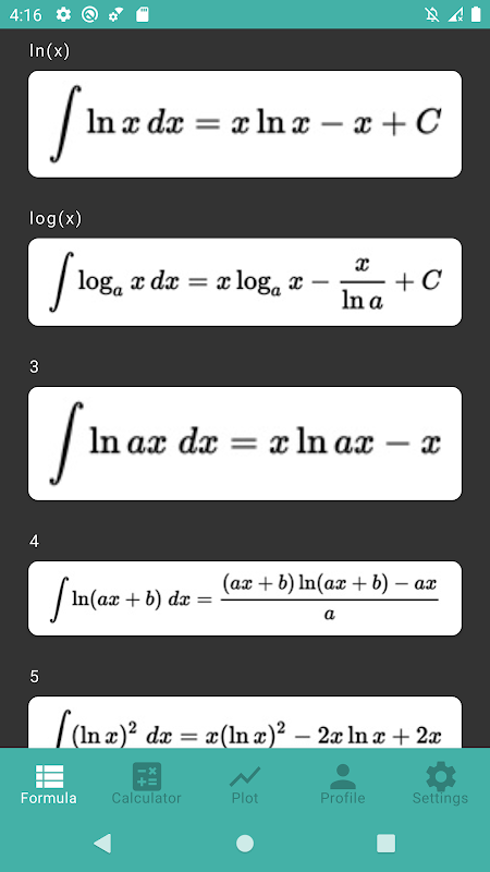 This app has a list of integrals and has an offline integral solver.