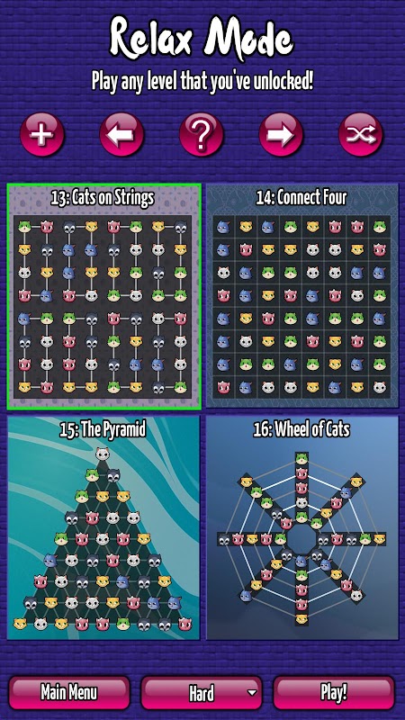 ในแต่ละด่าน คุณจะได้ทำสิ่งที่แตกต่างออกไป - จับคู่และเคลื่อนย้ายแมวในรูปแบบต่างๆ เพื่อทำให้กระดานสว่างขึ้นก่อนที่คุณจะหมดเวลาเคลื่อนไหว จับคู่แมว 2 ตัว 3 ตัว 4 ตัว จับคู่พวกมันเป็นเส้นตรง สามเหลี่ยม บนทางลาด ในวงล้อ สลับ หมุน กระโดด แตะ ในแต่ละด่าน ให้คุณจินตนาการถึงโลกใหม่ที่มีความเป็นไปได้ใหม่ๆ!