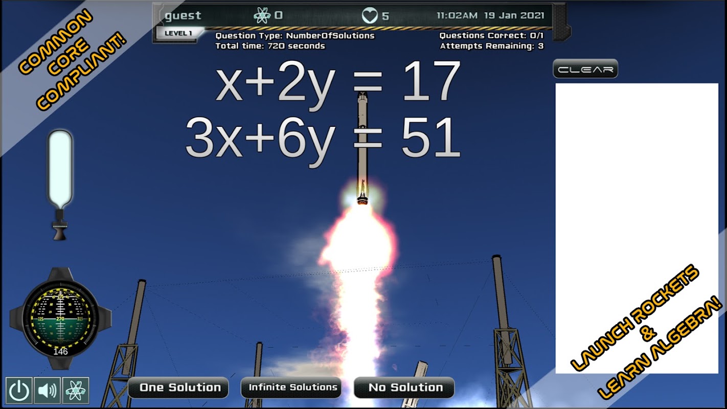 Assess skill in Number of Solutions according to educational standards. Rewarding levels of gameplay maintain engagement. You will forget you were doing math as you launch rockets into space! You may optionally buy reports analyzing questions missed about number of solutions. Teachers and parents may find this optional feature particularly useful.