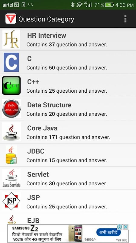 Javatpoint Interview questions app provides a list of all interview questions including HR, Java, SQL, PL/SQL, Android, C, C++, HTML, .Net, SQT, Oracle, Hadoop, Android etc.